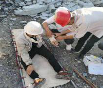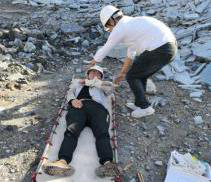 演練前,礦山應急小組對全體職工進行了組織動員,確保演練安全、有序。此次演練的場景為一名員工在礦山生產(chǎn)作業(yè)時收到高處落下的石頭砸傷手臂。演練開始后,安全員立即電話告知礦山應急小組并啟動物體打擊應急預案,應急小組立即趕到現(xiàn)場對傷員的傷口進行了包扎處理并用擔架將傷員運送到安全區(qū)。