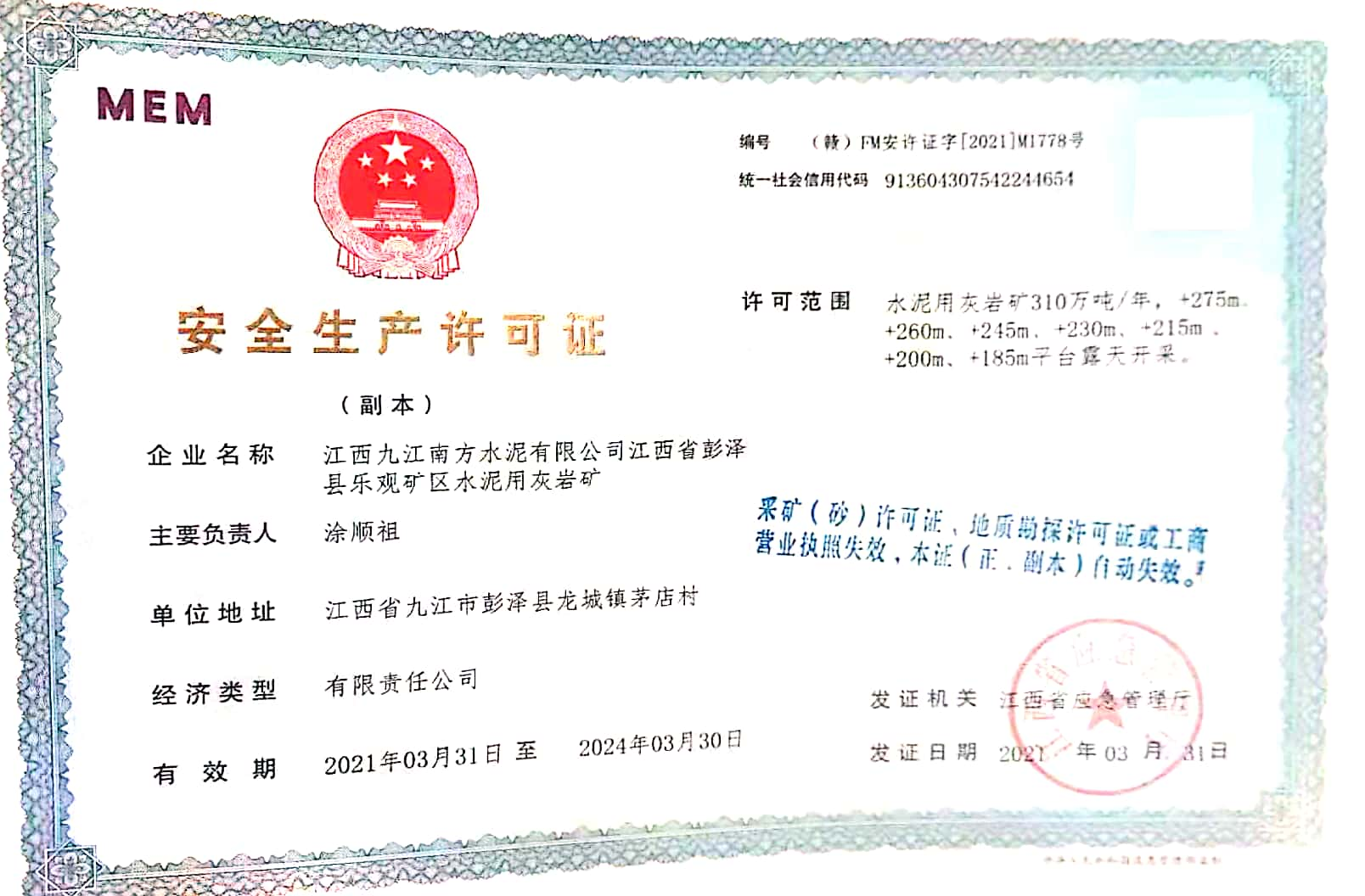 安全許可證順利延期,安全生產(chǎn)進入新篇章?!沤信頋煽h南方水泥樂觀石灰石礦